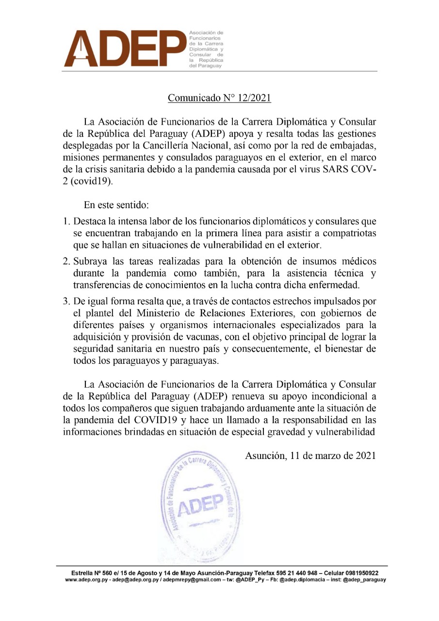 La Asociación de Funcionarios de la Carrera Diplomática y Consular de la República del Paraguay (ADEP) apoya y resalta todas las gestiones desplegadas por la Cancillería Nacional, así como por la red de embajadas, misiones permanentes y consulados paraguayos en el exterior, en el marco de la crisis sanitaria debido a la pandemia causada por el virus SARS COV2 (covid19).